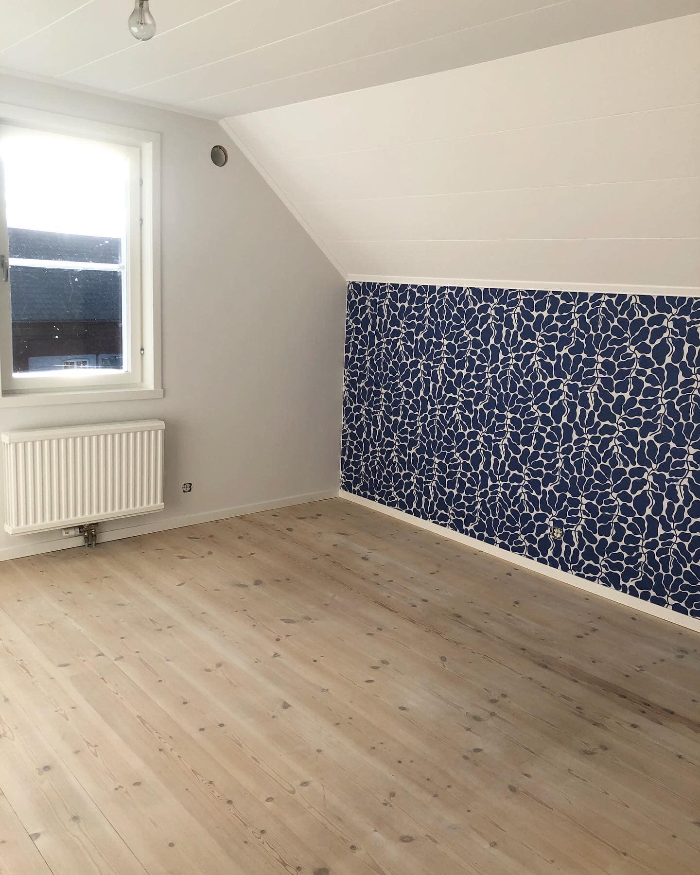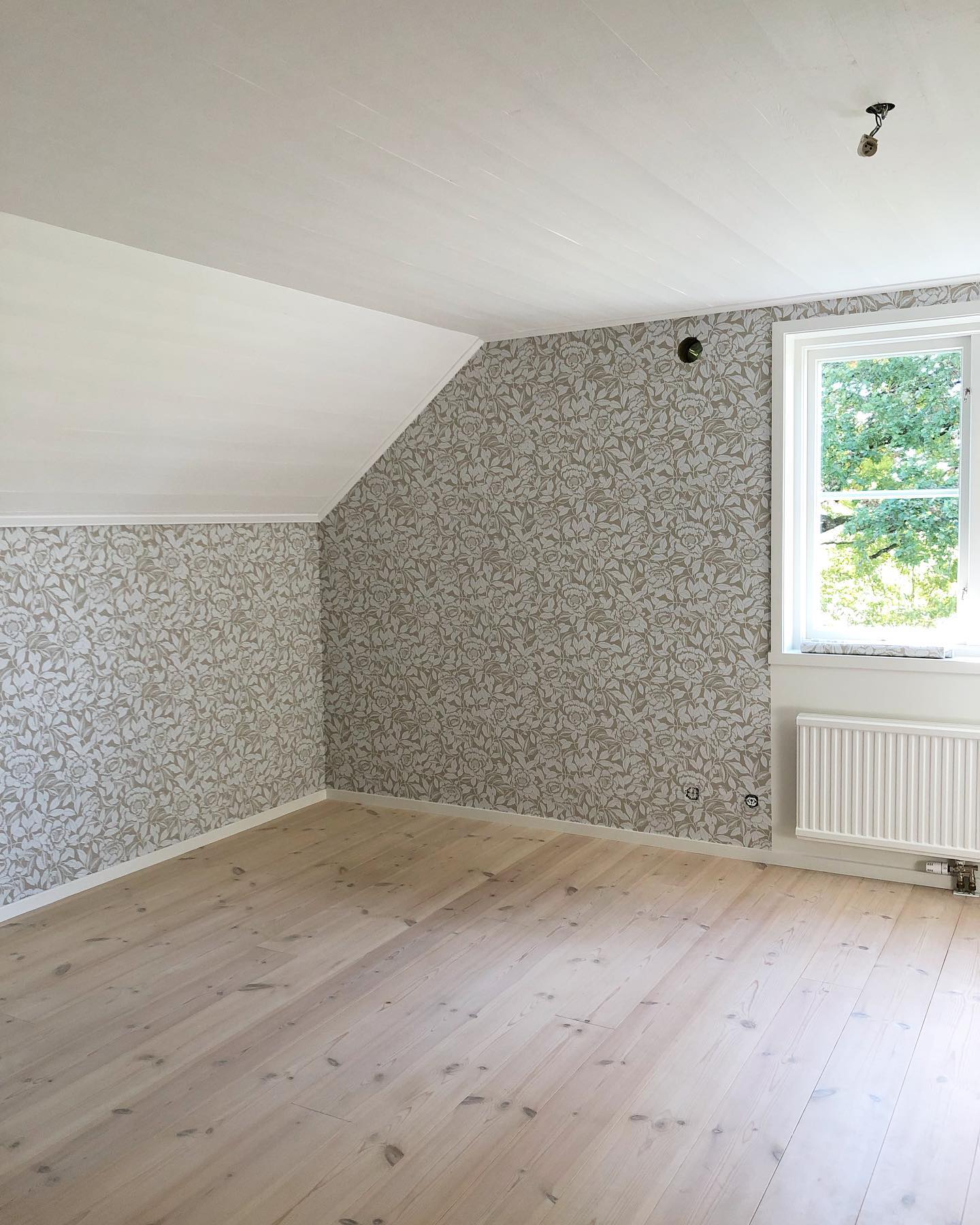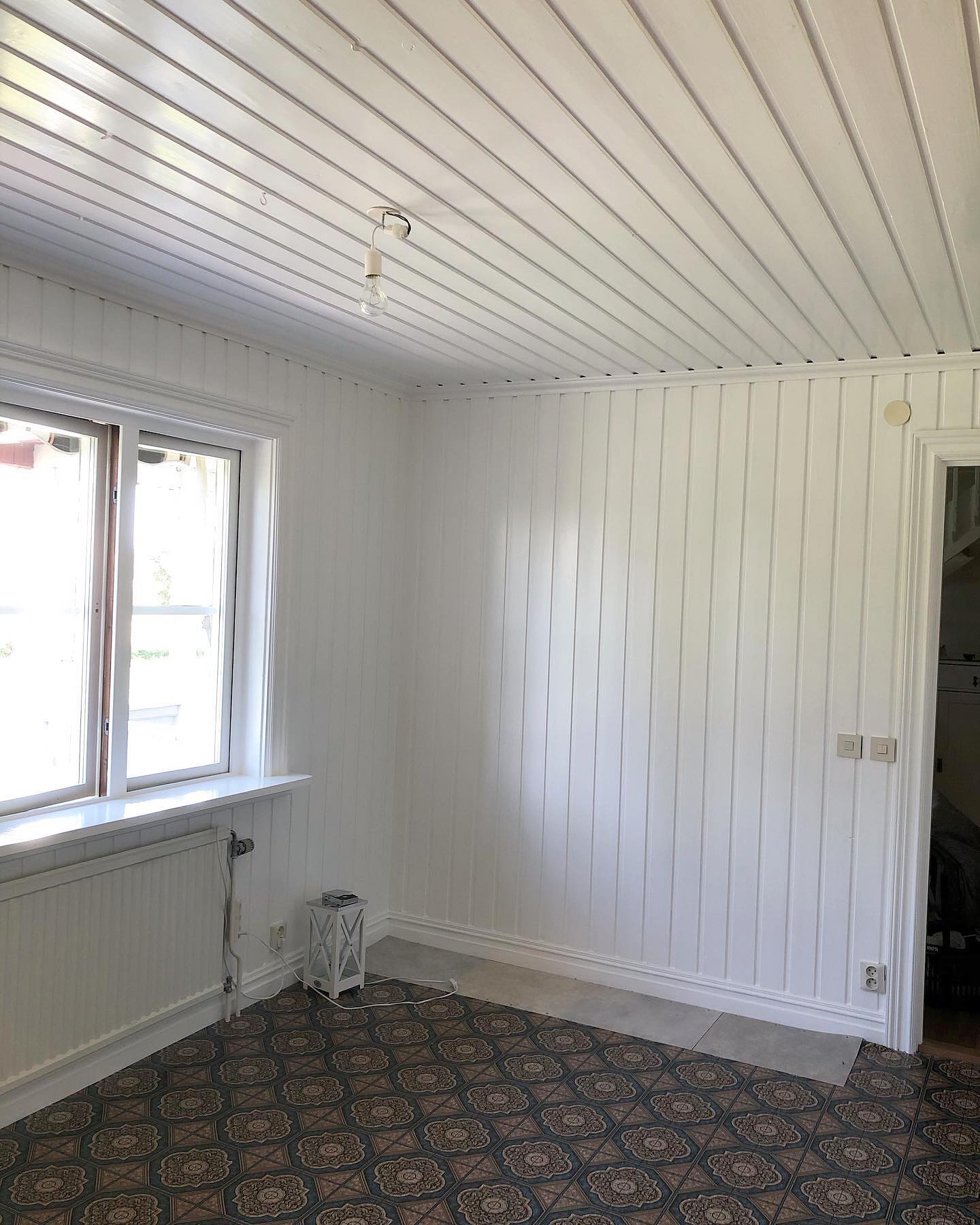 Paneltaket målades vitt och fick en fantastiskt fin tapet från Långelid/ von Brömssen som gjorde att rummet känns härligt ombonat!