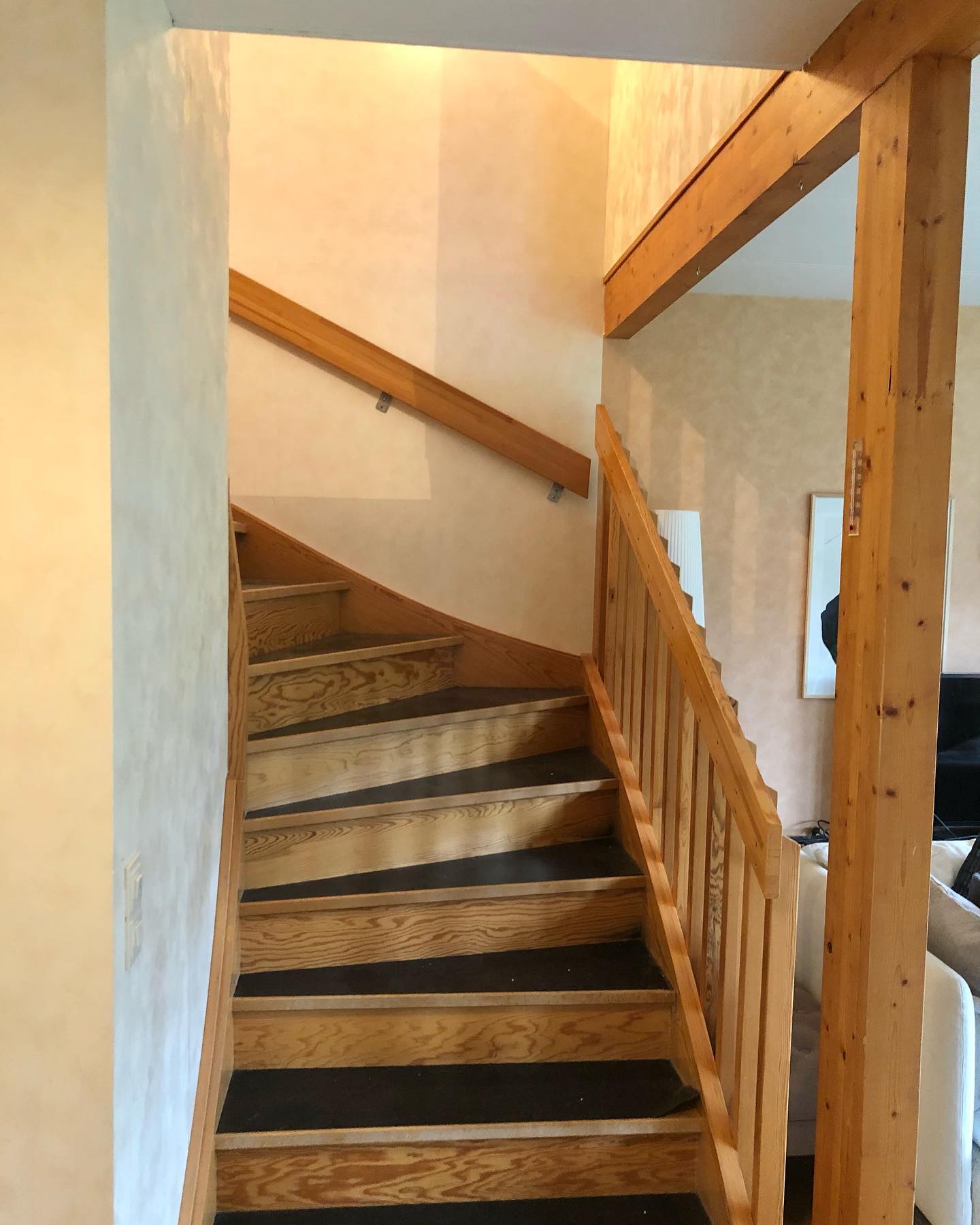 Denna trapp och vardagsrum hade strukturtapeter i sann 90-tals anda och kunden ville ha en uppfräschning.