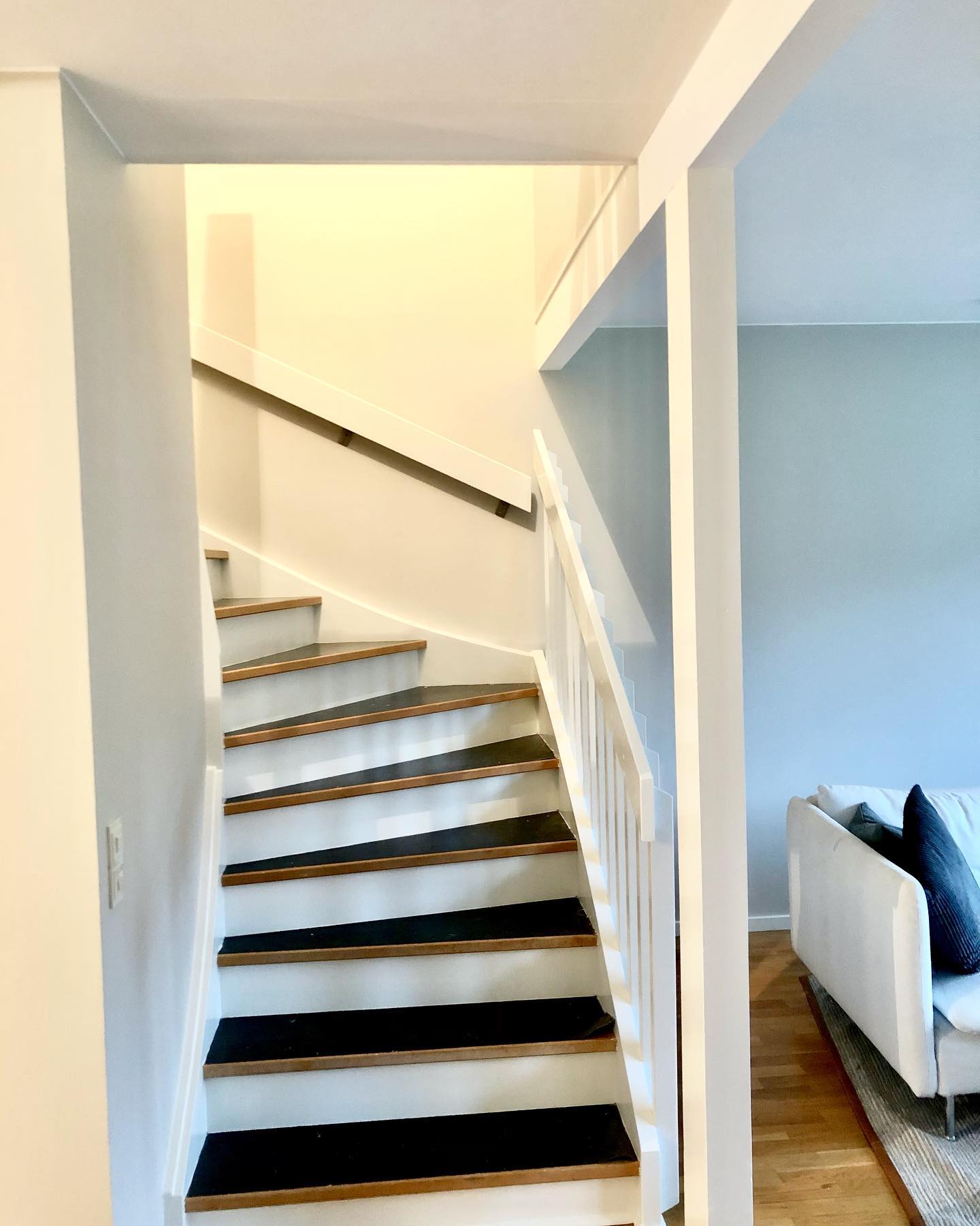 Trappan krävde fyra strykningar för att täcka, men vilket lyft det blev! Efter detta lades matta på trappstegen.