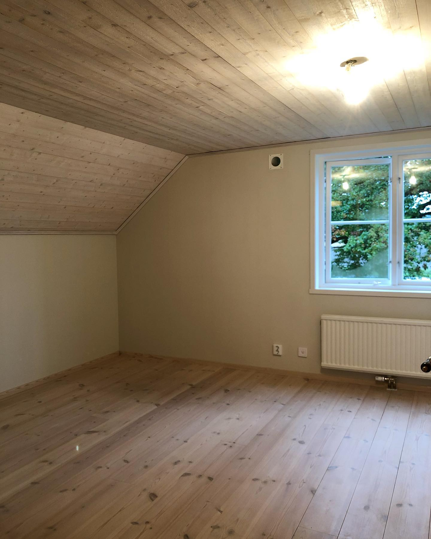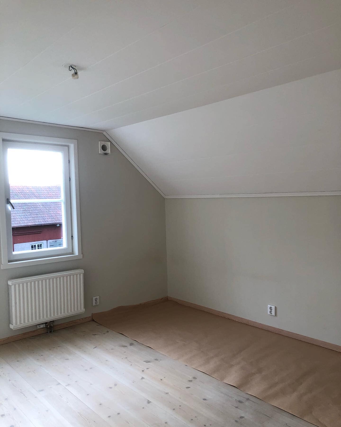 Strukturtapeten revs och väggarna bredspacklades och målades i en superfin kulör från Jotun som heter "Kalk".