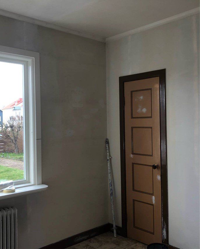 I detta sovrum ville kunden få bort strukturtapeten från väggar och dörrar och i stället få dem målade.