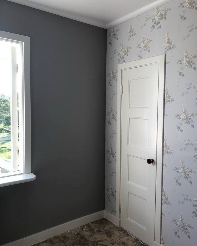 Efter många lager färg blev dörren och listerna tillslut vita, och vad fint det blev! Boråstapeters "Lilacs" sattes som fondvägg, och den går så fint ihop med de grå väggarna.