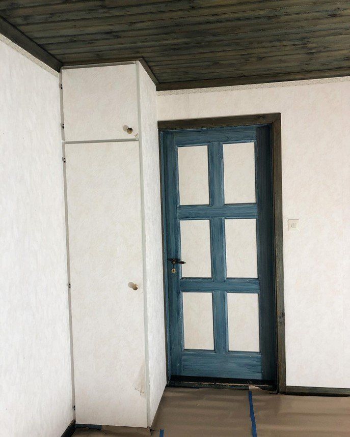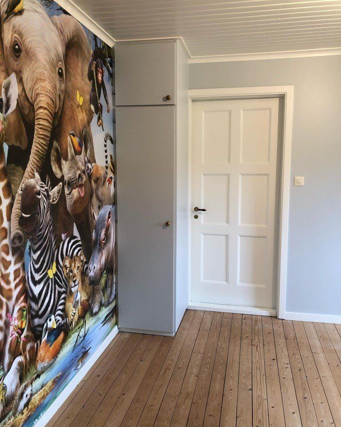 Garderoben målades in i samma kulör som väggen för att smälta in, och dörren blev vit. En rolig fototapet blev även satt på ena väggen.